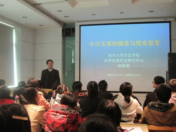 何志龙教授首先对杨栋梁教授作了简要介绍。随后,杨教授从历史的角度对当前由钓鱼岛引发的中日关系紧张进行了深入的分析。接着,杨教授按照时间顺序分四部分讲述中日关系。第一部分讲述古代中日关系的性质和特征,杨教授认为中日间原本就不存在二千年友好的神话,我们应该探讨不同局面的中日关系与当时双方的国力状况及政策的因果关系,例如在唐朝中日友好为何长达二百多年。第二部分杨教授讲述了近代中日两国的博弈,甲午战争是中日关系的转折点,此后中日两国在东亚地缘政治中的主次关系易位。第三部分是二战后,冷战格局下中日关系的离合,由对立到建交。第四部分为中日关系拐点的出现及其关系。杨教授指出,现在中日关系正处于转折时期,日本不断强化对中国的防范措施,中日两国已经由昔日相对单纯的战略合作变成错综复杂的战略合作与竞争者。