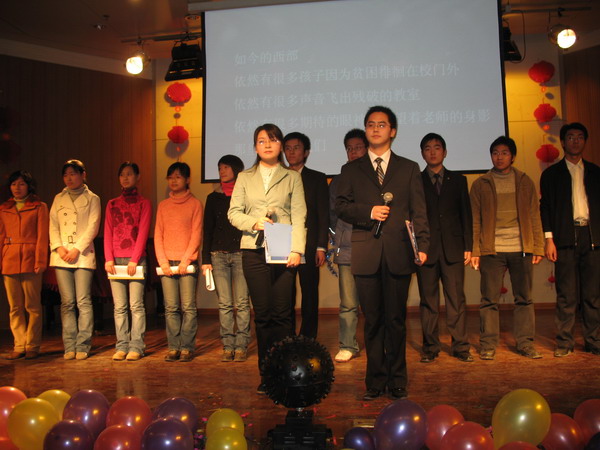 “挽起你的手,风雨同舟,并肩向前走,五湖四海共沐爱的阳光,我们是青年志愿者,用奉献共创温馨的家园。”一个《天使的声音》DV短片回顾了多年来学院青年志愿协会给长安区福利院,聋哑学校等地方送去的关爱和温暖。在场观众为之感动,会场掌声久久不停。