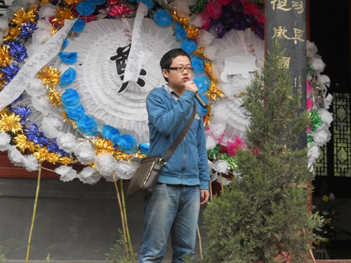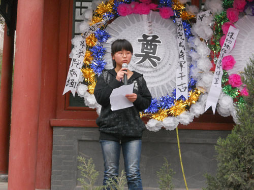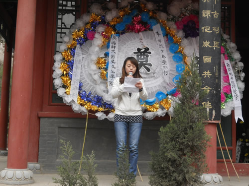 哀悼仪式在9:30正式开始,威廉williamhill体育组织部吕树杰担任主持。首先参与祭扫活动的全体师生向革命烈士致哀,默哀一分钟,在深沉的音乐声中向革命烈士敬献花圈,以托哀思;之后由学生代表岳可可宣读哀悼词,表达了全体师生对烈士们的敬仰与悼念,回顾了杨虎城将军为中国革命所做出的杰出贡献,其英勇事迹对当下青年有着重要的启迪作用,深刻地呼唤我们深思和自励;最后孙巍发言,他指出现代大学生应树立正确的世界观、人生观、价值观,理性爱国,践行社会使命,为社会主义现代化建设作出努力和贡献。