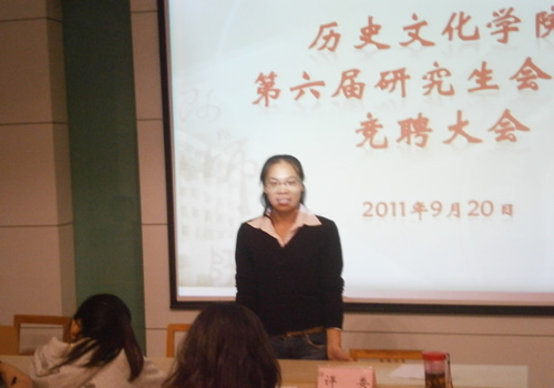 竞选大会于晚7点正式开始,研会副主席胡莉宣讲了竞选流程后,大会正式打开了帷幕。首先,胡莉向大家介绍了研会主席团成员,接着由办公室主任孙宛宜宣读本次纳新的评分标准;然后研会主席王春阳同学发言,他首先对于2011级参加纳新的同学表示了热烈的欢迎,并对我院研会的基本概况做了简要介绍,最后他鼓励参加竞聘的同学好好表现,力争展示出最好的自己。接下来,研会把时间留给了前来竞选的各位同学,同学们一一上台做了自我介绍和演讲。前来参加竞选的二十多位同学可谓多才多艺,藏龙卧虎。陈华伟、苏锟、司张浩等等同学的侃侃而谈,展示出他们对于历史专业的浓厚兴趣和自己的看法;朱晋一、韩敏等同学在专业之余还有自己对于体育、艺术等方面的爱好,也让在座同学对于以后我院各项活动更好的展开充满了希望…….竞聘过程中,研会各部部长副部长也都向竞聘同学提出了一些问题,得到了同学们妙语横生的解答。