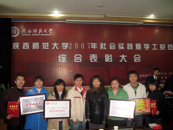 2007年12月13日,陕西师范大学2007年社会实践暨学工系统综合表彰大会在雁塔校区学术中心多功能报告厅顺利举行。我院党总支副书记杜海斌老师,团总支书记王耀明老师,辅导员梁丽和王帅老师以及获奖的学生代表参加了大会。
