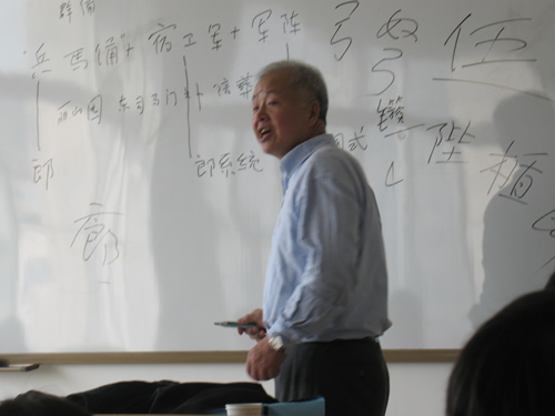 刘九生先生首先介绍了自己的治学之路,告诫我们不要怕犯错误,不要怕改正错误,这种治学严谨的态度,赢得了大家的尊重。接着刘先生用最简洁的语言讲述了自己的学术成果。主要分两个方面:第一个方面,与以往“兵马俑+宿卫兵+军阵”的看法不同,刘先生认为,“兵马俑”并非是“兵”,而是“郎”;相应的,“宿卫兵”应该是“郎系统”,即近臣侍卫;而“军队”应该是“礼仪图式”。所以,“兵马俑”应该是为秦始皇所能动用的中央军事系统中的郎系统。第二方面,刘先生介绍的是秦始皇陵标志性的建筑。通过考察和多方求证,他得出的结论是:1号坑是宫殿;2号坑是宫厩;3号坑是宗庙;4号坑是礼仪场所。刘先生独创性的见解,令我们大开眼界,博得大家的阵阵掌声。