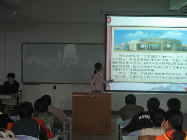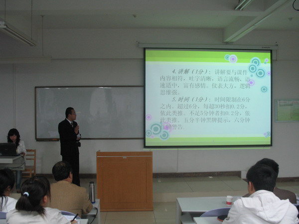本次比赛于4月9、11、18日共分三场进行,历时两周,共有37个团队参加了比赛。整个比赛于18日晚在文津楼506教室落下了帷幕。参赛同学以省份或地区组队,通过多媒体课件讲解的方式来介绍各地区的经济文化和风土人情,并将介绍教育资源情况、教育人才需求作为重点内容,充分的将专业特色及社会需要相结合。使学生在团结协作的同时加深了对家乡的热爱,在锻炼专业技能的同时开阔了视野,赢得了广大师生的一致欢迎与好评。本次比赛,使同学的课件制作水平、教师讲课技能得到很大提高,团队意识得到了增强。