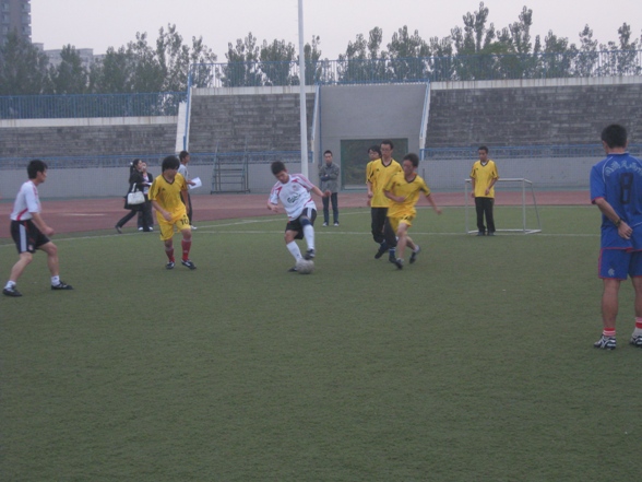 下午5点50分,裁判的哨声吹响了我院足球队与食品工程学院足球队比赛的序幕。我院队员在开场后,迅速进入比赛状态。双方在场上努力拼抢,积极寻找着破门的机会。在比赛大约进行15分钟左右,由我院的韦大兵同学率先破门,取得了领先的优势。但在上半场将结束的时候,对方在一阵混乱中敲破我队大门,比分搬平。此后,双方回到同一起跑线后又开始了积极的拼抢和寻找机会,可是直到比赛结束也没有攻破对方大门。在点球决战中,我院遗憾的以1:2告负,最终输掉比赛。