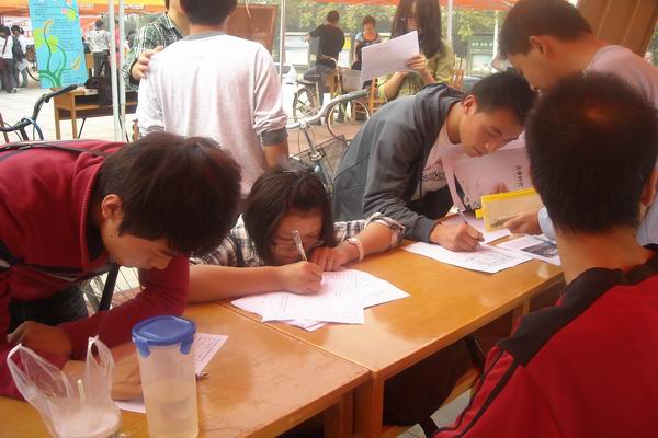 下午时分,纳新工作迎来了新一轮的高潮,同学们三五成群的涌向纳新现场,寻找自己心仪的社团。虽然已经连续工作了一上午,但社团的骨干们却毫无怨言,依然坚守岗位,以最大的热情和诚意迎接前来咨询和报名的同学。当日的纳新工作于晚20时左右结束。10日、11日,纳新工作继续进行。虽然受天气条件限制,纳新工作曾一度中断,但这并没有影响整体的工作效果。