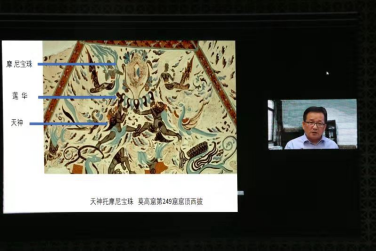 敦煌研究院研究员张元林以《另一种隐喻——莫高窟第 249 窟、第285 窟窟顶东披“天神托举莲华摩尼宝珠”图像探源》为题发言。张元林研究员首先重点关注与“天神托举莲华摩尼宝珠”画面相关的研究和观点;其次,分别对这两窟东披“天神托举莲华摩尼宝珠”画面进行了解析,指出了此前不被学界所关注的画面特征;对这幅画面何以被定名为“天神托举莲华摩尼宝珠”进行了解释;最后,通过与西亚、中亚地区所见的类似或相似图像的比较,认为这两窟窟顶东披“天神托举莲华摩尼宝珠”图像表达的主题固然是佛教的,但其图像创意的源头却非单一,而是有着多元的信仰背景,尤其反映了西亚、中亚地区更为古老的“太阳(光明)崇拜”、“圣树崇拜”等信仰和图像对佛教图像的影响。