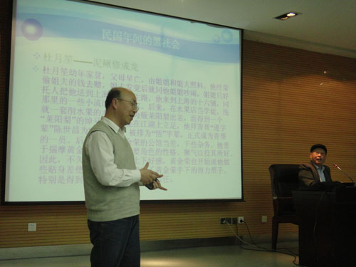 本次讲座以“清代三大帮会和民国的黑社会”为主。76高龄的秦教授结合自己多年来的研究,在众多史料为依据的前提下,以缜密的逻辑、灵敏的思维、清晰的条理,超强的记忆为大家详实讲述了清代三大帮会——天地会、哥老会和青帮的起源、发展、作用主要活动,及其民国黑社会的三大主要人物——黄金荣、杜月笙、张啸林的发迹和相关主要活动及其部分趣闻轶事。其间,秦宝琦教授采用人物角色话语模拟、活动场景再现等多种方式真实、慷慨激昂、热情饱满,生动形象地把一个精彩纷呈的真实“江湖”呈现给大家,让大家在听觉和触觉上都享受了一次别开生面的“江湖盛事”。