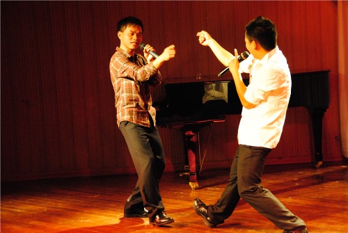 晚会在火热激情的开场舞《保利亚之韵》中徐徐拉开序幕,活泼开朗的几位女孩用舞蹈张扬着青春和梦想,别样的民族舞魅力点燃全场。一曲高亢清亮的《在那东山顶上》将大家的思绪引入豁然旷达的山岭云间,一首《明天你好》则将我们待会温馨甜蜜的世界,向现在致敬,向明天问好。整场晚会沐浴在爱的阳光之下,《因为爱情》令人如痴如醉,两对新人的爱情故事让人感动不已,抛洒幸福的喜糖博得全场的祝福和热情欢呼。由2008级历史学的四位男生带来的《最炫民族风》以火热的激情,动感的旋律,引爆全场沸点,而接下来的师生互动环节更是将晚会推向一个高潮。在同学们的欢呼中几位老师先后被请上舞台,在观看了一段视频后,通过自己的解读再现电影片段的场景。王大伟老师和李亚平老师为《让子弹飞》的配音精彩非凡,李化成、朱君孝和徐涛老师为《康熙王朝》的配音和表演彰显出一代帝王的气度,贾二强、黄寿成和焦杰老师为《大话西游》片段的表演博得了全场掌声和欢呼。毕业晚会中,2009级同学也积极参与其中,刘冰清同学偕同2009级宋丹同学带来了幽默风趣的相声《我的大学生活》,诙谐搞笑,也让大家回味了大学时期的懵懂和青涩;高文洋同学带来京剧《锁麟囊》,让我们品味到传统曲艺的魅力。此外,舞蹈《新娘》、《大漠飞鹰》,吉他弹唱《情非得已》都给大家留下了深刻的印象,给广大师生献上了一份非凡的视听盛宴。