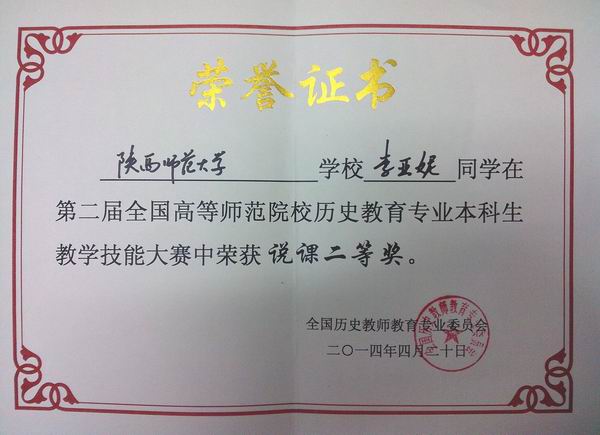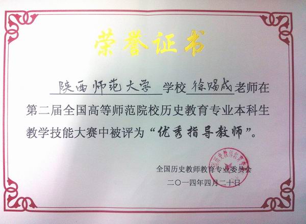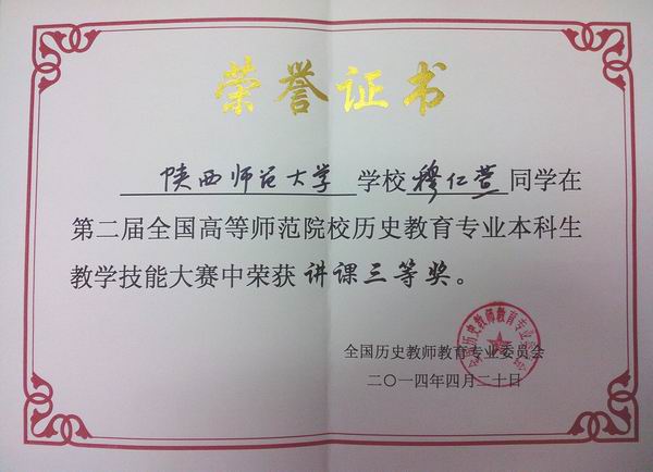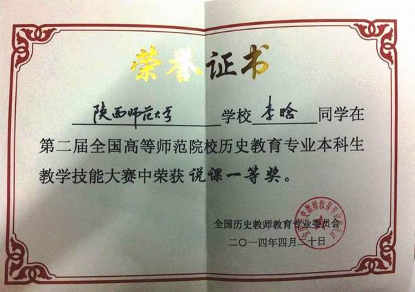 我院李晗同学荣获“说课组一等奖”,李亚妮同学荣获“说课组二等奖”,穆仁萱同学荣获“讲课组三等奖”, 徐赐成老师荣获“优秀指导教师奖”,陕西师范大学荣获“优秀组织奖”。