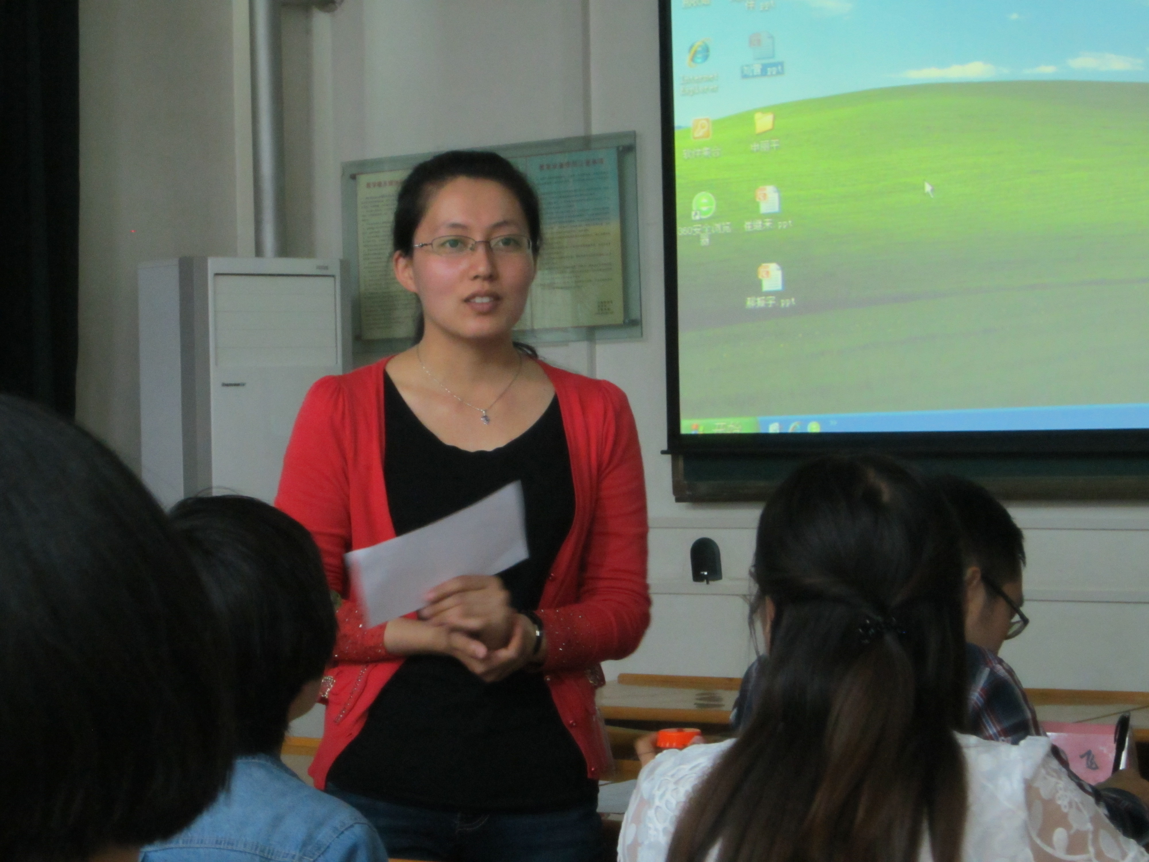 首先,主持人介绍了此次比赛的规则。本次比赛采取三人一组的形式进行,每组选手说课结束后由评委点评,最后按照选手的总分数高低决出比赛名次。接下来,参赛同学纷纷展现自己的“教师”魅力。第一位上场的申丽平同学以当前最热的《舌尖上的中国》开启了说课内容;郝振宇同学以端正的教态、洪亮的嗓音赢得了观赛同学的掌声;周婷婷同学则以内容充实的课件、循序渐进的引导带领大家进入真实的课堂;邓凤玲同学更是以清晰的说课思路、流利的语言得到同学们的赞许;最后出场的刘霄同学将此次比赛引向了高潮,她以精美的课件、充实的说课内容和自信的表达征服了评委和现场同学。