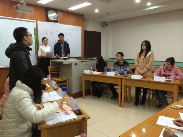 “大学·人生”主题辩论赛初赛于11月19日在文渊楼516教室召开。初赛由学院2012级、2013级本科生六个班级各派一只代表队参加比赛。六支队伍抽签分成三组,并分别就“名师是否定能出高徒”、“孙悟空和猪八戒谁更适合做大学辅导员”和“宽容式管理的利弊关系”等论题展开激烈辩论,双方辩手各不示弱,引经典,举事实,辩论现场紧张激烈。最终,初赛中脱颖而出的2012级古典文献班、历史创新班、历史学2班、文物与博物馆班四支代表队进入半决赛。
