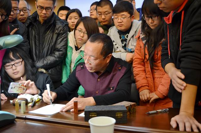 首先,周晓薇教授简要介绍了陈根远老师的学术成就,并对其在篆刻方面所取得的成就表示敬佩。讲座开始后,陈先生以时间为线索讲述了中国古代印玺发展经历。他认为印玺的发展经历了四次高峰时期:战国时期,名其曰“战国古玺”;秦汉时期,印玺逐渐开始向平、厚等特征定位;明清时期,印玺发展到一个自觉的时期;改革开放以来,印玺发展得到极大提升。陈先生展示了大量精美的印章图片,广大师生对于玺印的发展有了更为生动认知与了解。最后,马先生现场进行了篆刻创作,一刀一法,游刃有余,娴熟高超的技艺深深地吸引了在场师生。