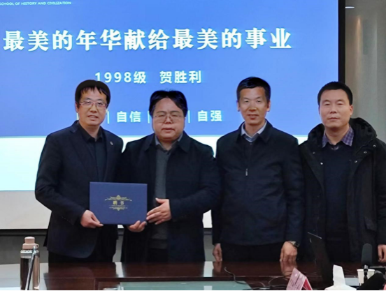 讲座开始前,李秉忠向贺胜利颁发了陕西师范大学校外兼职辅导员聘书,希望以此为契机,学院的院友能有机融入到学院的人才培养过程中,不断提高卓越历史教师的培养质量。