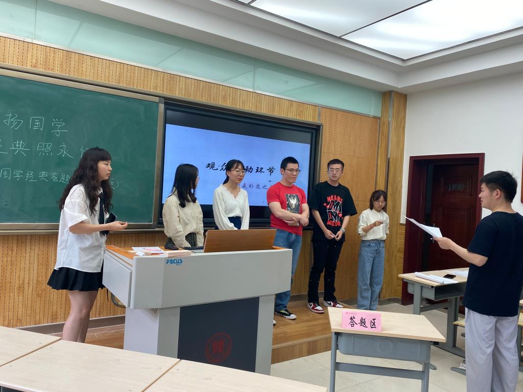 比赛共分两个环节,选手根据现场抽签所决定的上场顺序进行比赛,第一环节由各参赛小组依次现场选择一套题目进行现场作答,评委针对同学们答错的题目进行点评和讲解。第二环节是开放问答环节。各小组任意抽取一道题目,各组成员进行五分钟的思考和讨论,由小组代表成员进行发言,各组回答完毕后评委老师进行了点评、讲解并进行最终打分。