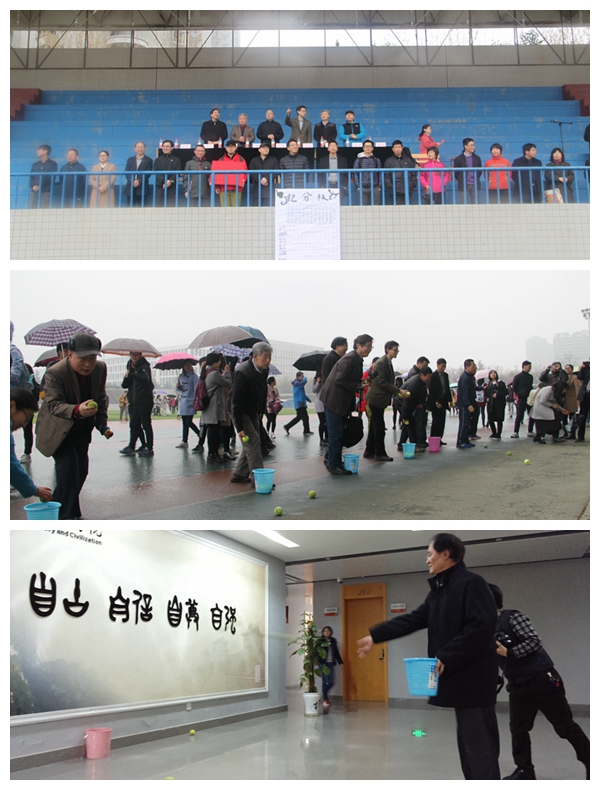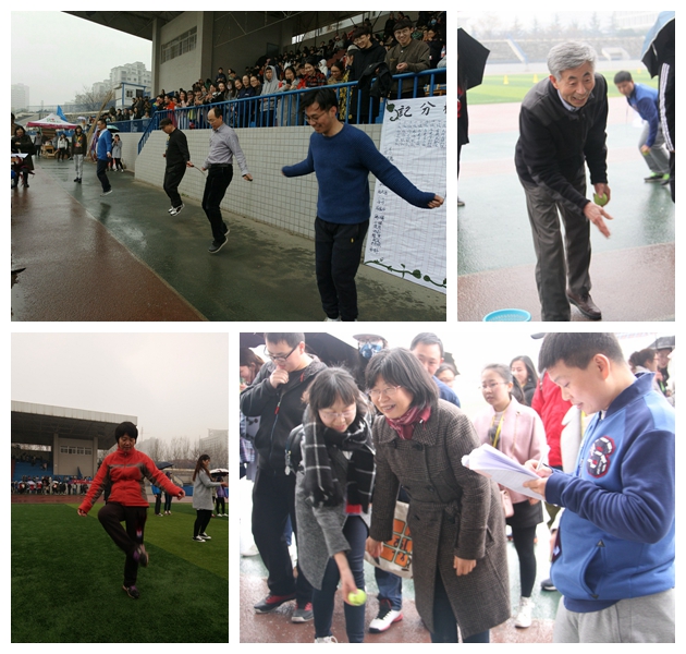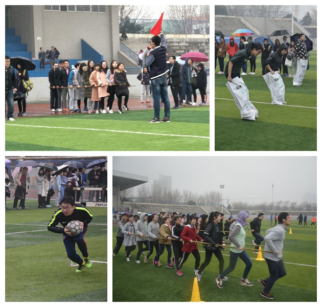 学院2017年春季运动会本着趣味体育的原则,在原有的激烈比赛中涵括开心元素,使运动会全程充满欢乐愉快的氛围。其中个人赛有踢毽子、跳小绳、小球投准和仰卧起坐;团体赛有负重接力、袋鼠跳、接力游戏、和谐号动力火车和跳大绳。各类比赛项目在绵绵细雨中紧锣密鼓地有序进行,雨水浇不灭运动健儿们的熊熊烈火,真有“春风吹,战鼓擂,史院师生谁怕谁”的运动气势,运动员们以饱满的精神风貌进行着一场又一场的比赛,如同下起的小雨跳动在操场上挥洒着青春与活力。