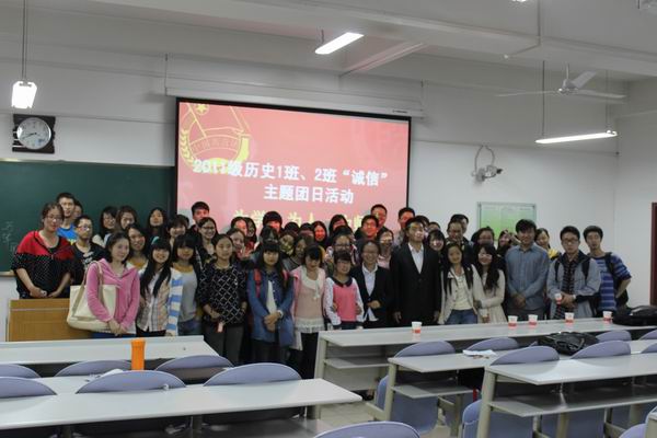 为响应和贯彻学校四月诚信教育月的活动精神,加强师范生职业道德和理想建设,2011级历史学一班和二班于4月24日晚上19:00-21:00,在文津楼610教室联合举办了具有师范特色的“为学·为人·为师”诚信主题团日活动。此次活动由历史一班团支书李亚妮和二班团支书于永洋主持,并且诚邀了辅导员张志祥、学院团委学生会组织副部长胡晨光、黄月,以及2011级博物馆班团支书宗亚茹等嘉宾参加。