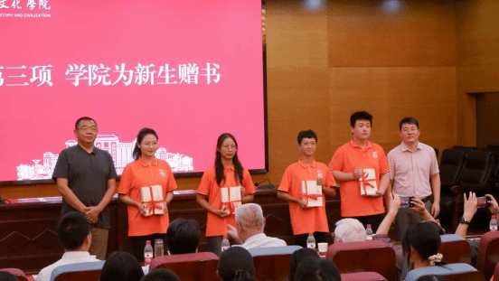 副院长冯立君教授与学院党委副书记、纪委书记、副院长李晨子老师代表学院向新生赠送书籍,以此勉励同学们用知识武装自己,怀抱赤子之心,激扬奋斗之帆,续写新时代威廉williamhill体育学子的崭新篇章。