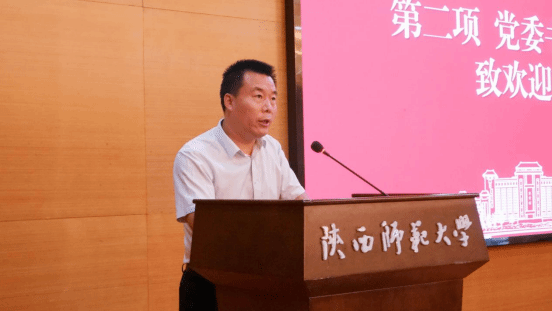 党委书记孙伟向新生致欢迎辞。他代表学院党委全体师生向新同学们表示热烈欢迎,并希望同学们恪守抱道不屈、佣书自雄的校训,自由、自信、自尊、自强的院训,以自强不息、不断进取之决心和行动彰显新时代师大历史学人的使命担当。