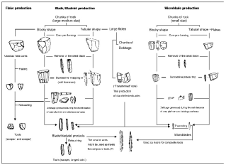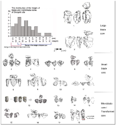 图二:(左)西施、东施遗址出土石核的形态及其尺寸分布; (右)西施、东施遗址石制品生产技术流程的复原图