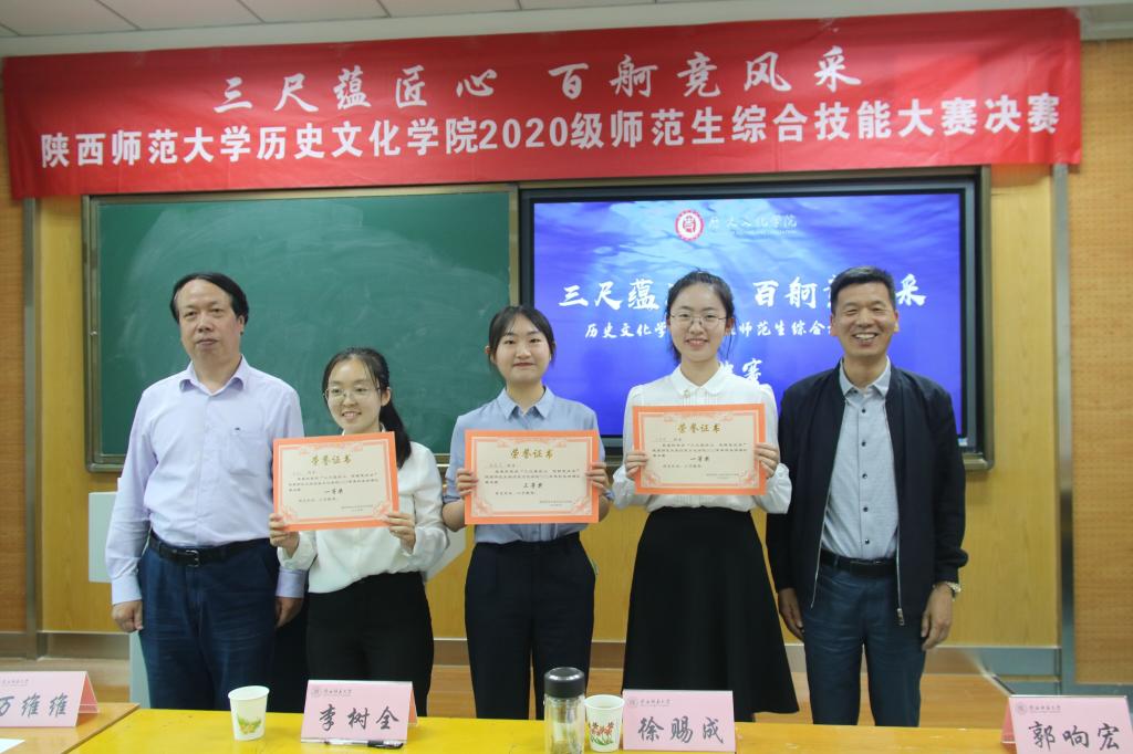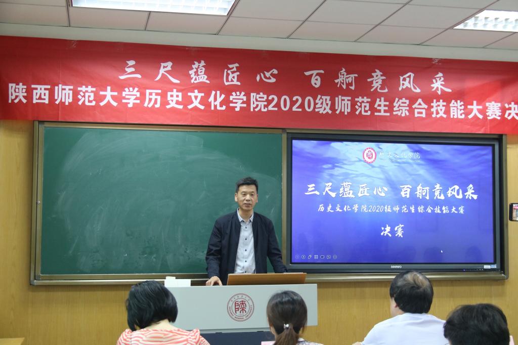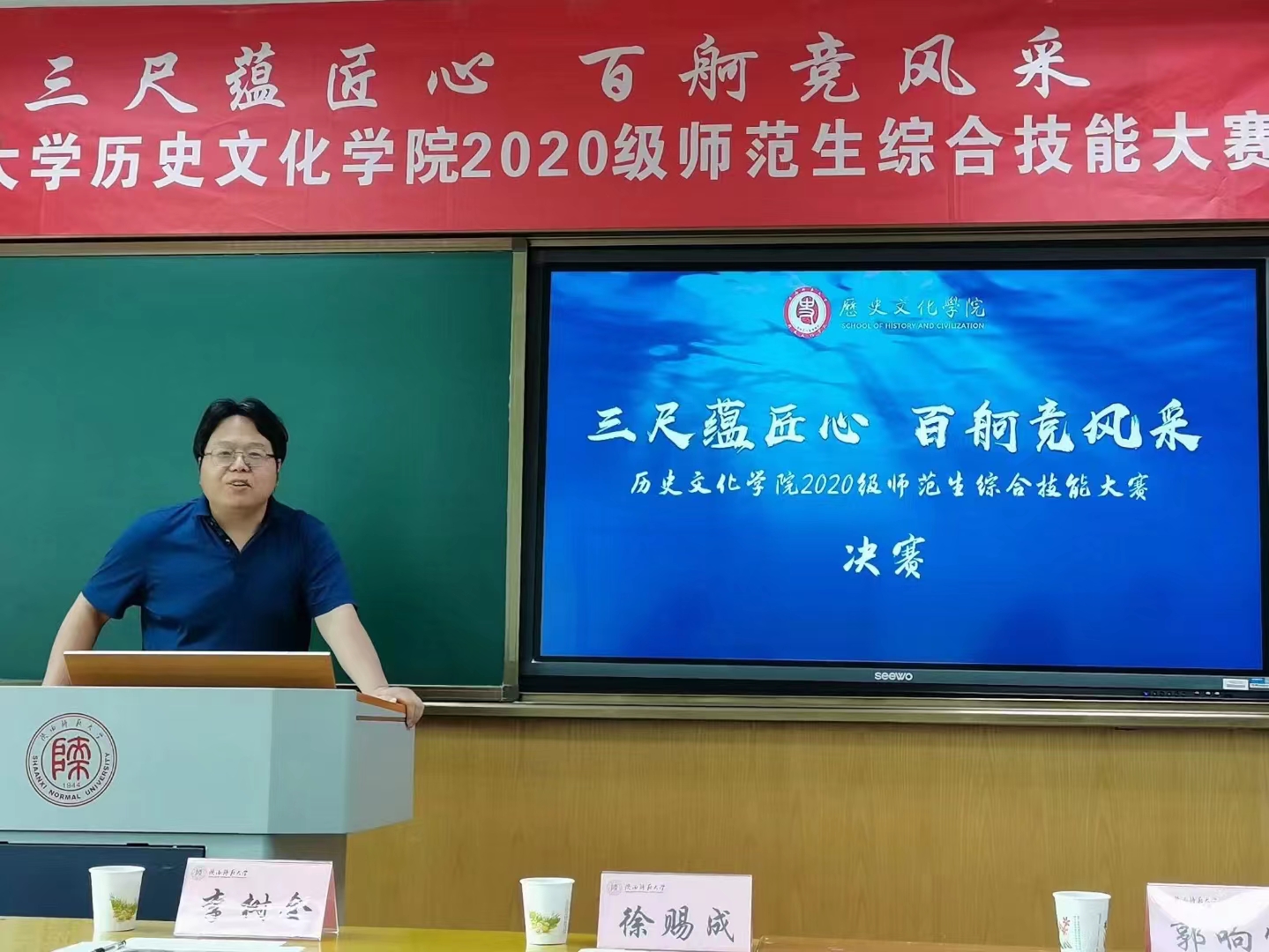 为提升师范生教师专业能力与素养,为师范生交流学习搭建平台,5月25日下午威廉williamhill体育在文渊楼3308教室举办“三尺蕴匠心,百舸竞风采”2020级师范生综合技能大赛决赛。西安市新城区教师进修学校副校长、特级教师李树全,学院历史教育学学科带头人徐赐成教授,西安市曲江第一中学高级教师万维维,专业教师蔡娜副教授担任本次比赛的评委。