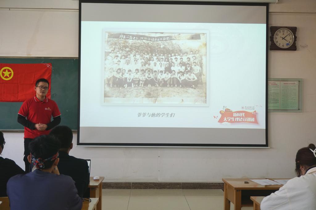 课堂上,新时代大学生理论宣讲团宣讲员龚鸿源和牛怿潼分别以《一柄红烛传家风》和《红烛照亮西部田,扎根教育矢志坚》为题目,从不同的角度诠释了“西部红烛精神”。龚鸿源同学以自己爷爷数十年教书育人的经历为例,赞颂了老一辈教师莫问收获,但问耕耘的奉献事迹,号召同学们传承家风,弘扬西部红烛精神。