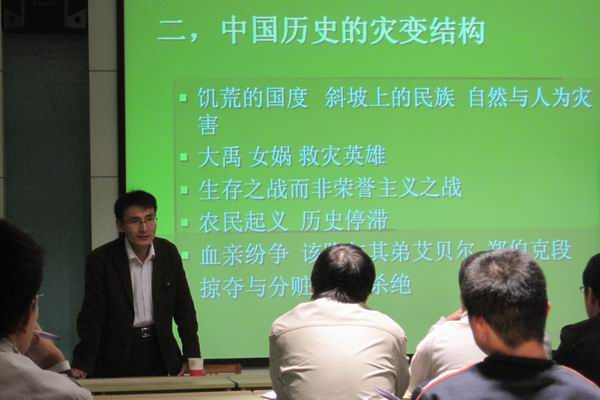 报告过程中,他从“灾民文化与灾变建国”、“中国历史的灾变结构”、“灾民文化特征”和“现代化途径”四个主要方面展开论述;并分别进行了具体的分析和论述。在提到灾民文化与灾变建国部分时,王博士提到中国文明起源的几种说法,如治水工程派,地理文化冲突论的,以及他本人比较认可的灾变论;并进一步提及中国文化的两种现象,即强力崇拜和恩人崇拜。他还在后续的部分中通过大禹,女娲等的讲述进一步向同学们解释和阐述其观点。这场报告会的气氛热烈。最后王博士向大家推荐了一些参考书目,并希望有兴趣的同学可在课后阅读,与他进行深入讨论。王博士清晰的思路、流利的表达、新颖的论点和独到的见解,给到场的同学们留下了深刻的印象。