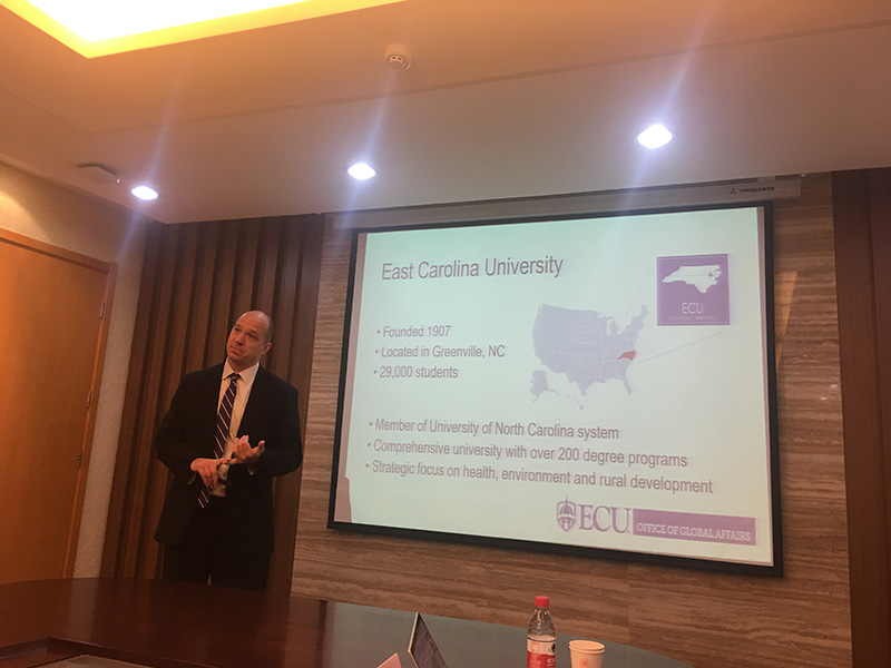 2018年10月31日,美国东卡罗莱纳大学(ECU)国际交流处处长Jon Rezek教授到访我院并与我院师生交流,李秉忠副院长参加了会议并与Rezek就今后的合作进行了讨论。Rezek教授此次来我校是为了我校2019年寒假开始在ECU进行的卓越游学项目进行宣讲,ECU与我院保持合作关系长达14年的学校:我院的世界文化交流课程正是在ECU的发起下成立的一个国际合作课程。