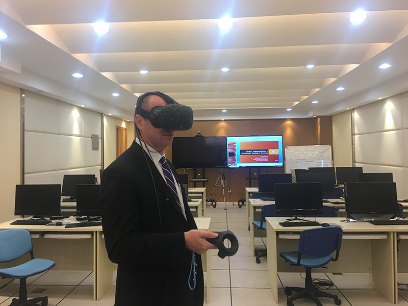 报告结束之后,Rezek教授参观了陕西省丝绸之路历史文化虚拟仿真实验教学中心,并体验了中心的历史文化虚拟仿真项目,他印象非常深刻,并希望这种新的教学方式能够在世界文化交流课程中得到运用。