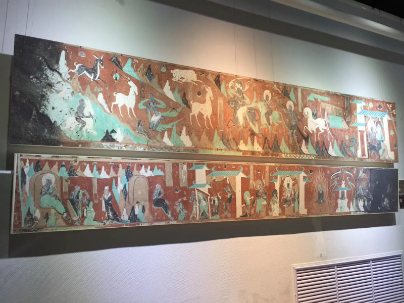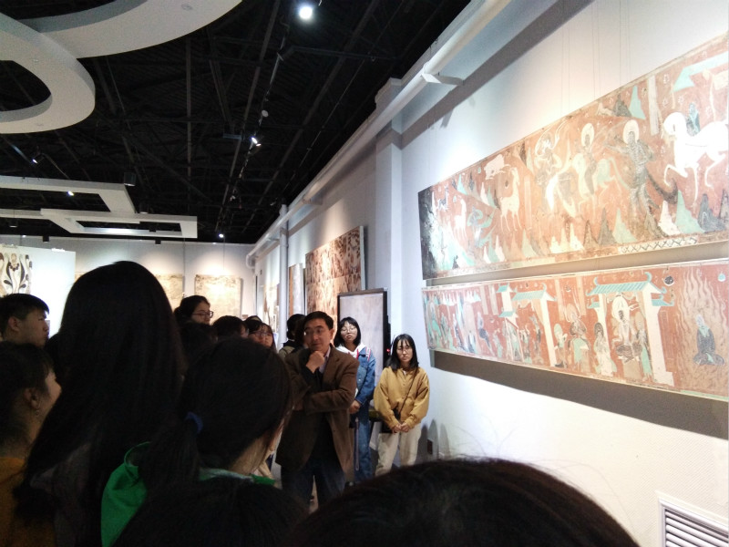 进入六艺楼,映入眼帘的是有浓厚敦煌特色的展厅布置。沙武田老师对前来参观的同学们表示欢迎,他用轻松幽默的开场语,拉近了与同学之间的距离。看着一幅幅古朴清晰的敦煌壁画,沙武田老师向大家一一介绍了它们的“前世今生”,赋予了敦煌壁画新的内涵与深意。沙武田讲到,敦煌的壁画之所以能够如此清晰地呈现在我们面前,很大程度上得益于高保真数字化技术还原的运用,他提醒同学们研究古代历史遗迹要与现代技术结合联合起来。接着,沙武田老师讲述了从公元4世纪到公元14世纪时间跨度长达1000多年的敦煌壁画作品。同学们走入本次展览特别建造的仿真洞窟,沙老师为同学们讲述了洞窟的构造,以及在敦煌保护洞窟壁画的经历,同学们对一代代敦煌考古工作者的辛勤付出肃然起敬。