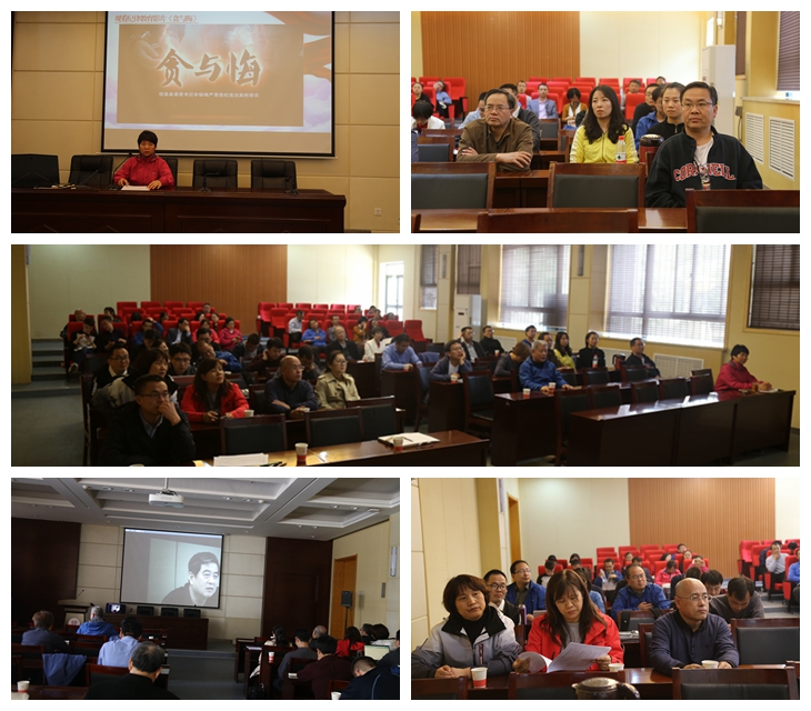 会议第一阶段,由党委副书记程蕾带领大家集体学习《中管高校党员干部违反中央八项规定精神典型案例通报》;第二阶段集体观看警示教育片《贪与悔》,该片以榆林市佳县原县委书记辛耀峰违纪违法事实为题材,记录了辛耀峰从人民公仆走向党和人民对立面阶下囚的转变,深刻剖析了辛耀峰淡忘规矩、初心丧失、心理失衡、索贿买官、政绩注水、阳奉阴违的违法犯罪根源,并对全体党员干部和教师党员进行警示教育。