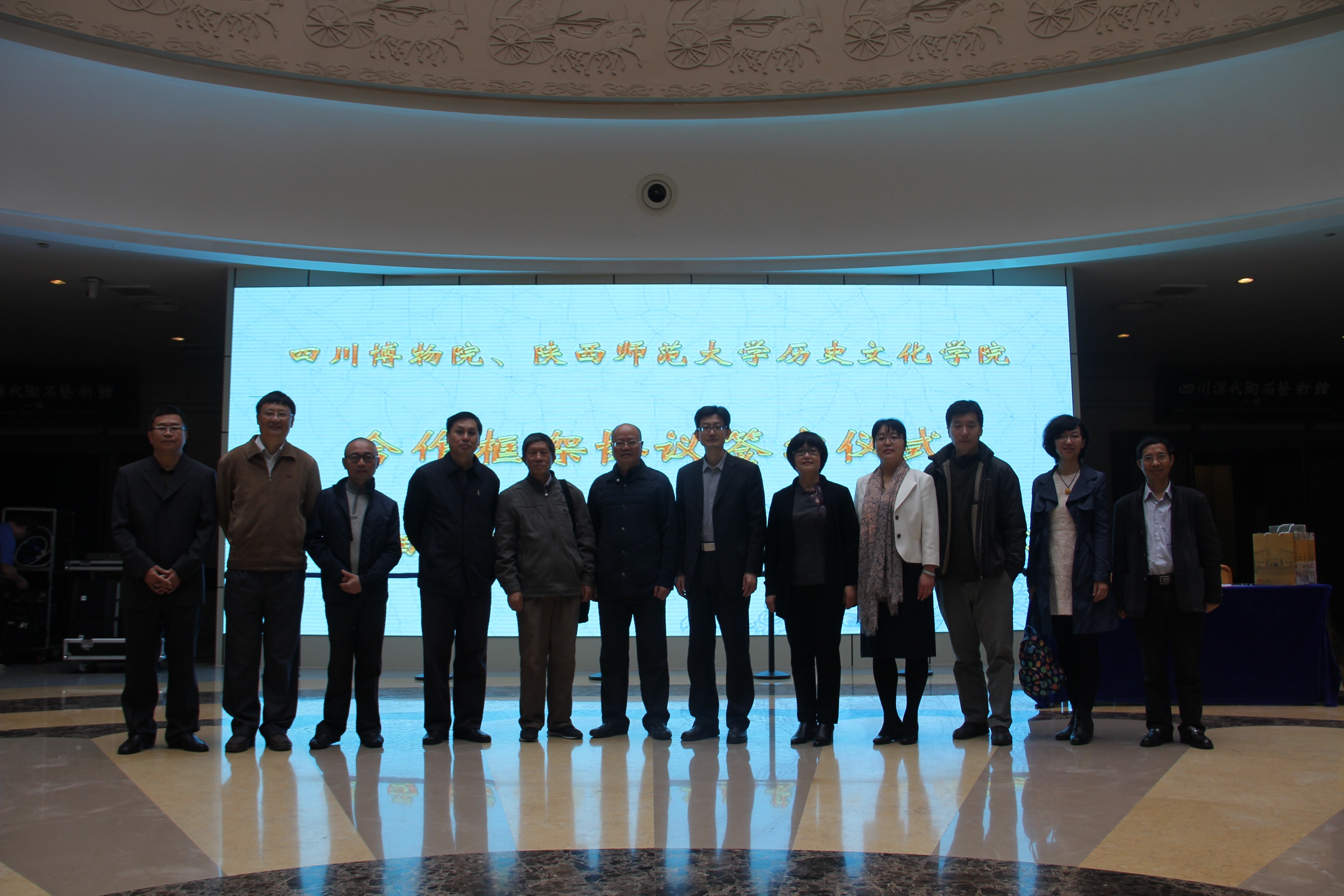 11月3日上午,威廉williamhill体育·四川博物院合作框架协议签署暨“威廉williamhill体育教学实习基地”挂牌仪式在四川博物院举行。四川博物院盛建武院长、威廉williamhill体育何志龙教授在合作框架协议书上签字,并为实习基地挂牌。我院丁虹书记、张懋镕教授、郭妍利副院长、徐涛副教授、王帅、张寅、黄薇老师以及2012级博物馆班学生参加了签约挂牌仪式。双方表示希望以合作框架协议为基础,加强科研课题合作,用具体项目来支撑,在博物院资料整理、课题研究、文物保护等方面开展课题与项目合作;也希望陕西师范大学能多为四川博物院输送更多的高素质专业人才,促进共同发展。会后,教师代表与四川博物院宣教部、典藏保管部、文物保护中心等部门工作人员进行了交流与学习。下午,张懋镕教授在四川博物院作了题为《近年发现的重要西周铜器》的报告,并与博物院工作人员、四川大学青年学生、博物馆爱好者进行了热烈的讨论。