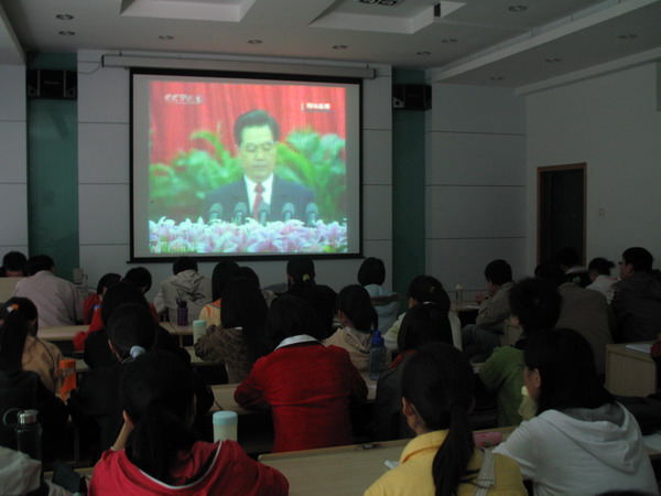 10月15日上午9时,威廉williamhill体育05级本科生党员、预备党员及入党积极分子在院党组织的安排下在历史院多媒体教室集体收看了中国共产党第十七届全国代表大会的现场直播。