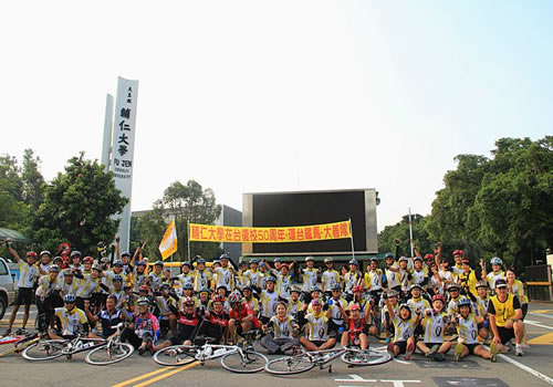 天主教辅仁大学前身为私立北平辅仁大学,1960年在台复办。该校教学水平在全台位列前茅,并一直与我校有着良好而密切的交流关系。值此辅仁大学在台复办五十周年之际,我校作为辅仁大学的姊妹学校之一,被邀请参加校庆系列活动之铁马环台。经过层层选拔,我院研究生陈冰同学,以其丰富的骑行经验,获得了一个宝贵的学生名额,并与我校其他四位师生共同赴台完成了本次活动。