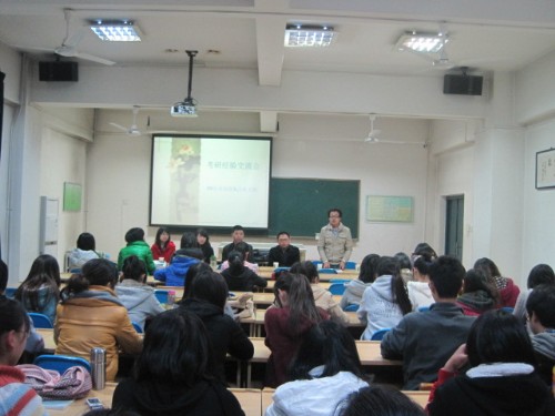 活动中2011级的研究生首先分别就考研需要注意的事项结合自身的经验进行了阐述,同时要求同学们志存高远,树立远大的人生目标,把考研当做自己人生中的一次飞跃。同学们深受鼓舞,然后还强调了考研中的一些具体问题,如英语、政治、专业课的复习等。这些宝贵的经验对两个班的同学帮助极大,有利于同学们制定正确有效的考研计划。其后进行了提问环节,现场气氛活跃,同学们踊跃提问发言,学长学姐们针对09级同学提出的问题做出了详细的解答。活动最后在晚上9点拉下了帷幕,大家合影留念。