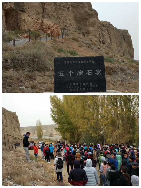 10月20日,前往了肃北的五个庙石窟。它位于莫高窟正南约100公里、肃北蒙古族自治县县城西北20公里的党河西岸峭壁上。洞窟开凿在党河水冲刷形成的砂崖上,砂崖高约30米,洞窟悬于半崖,距地约12—15米。此次参观主要有四个洞窟,沙武田老师对窟內西夏时期的重点壁画给学院师生进行了详细生动的专业讲解,同学们对西夏社会历史与文化有了新的认识。历院师生考察团一行紧接着驱车前往西千佛洞参观,西千佛洞最早建于北魏时期,通过参观5个洞窟,大家又进一步了解了隋代和初唐时期的壁画特点。参观结束后,考察团前往最后一站悬泉置遗址,该遗址是迄今为止唯一发现和发掘的汉代驿站遗址,通过参观让我们对汉代邮政系统、邮驿制度以及汉代西北边郡地区的政治、经济、军事及文化生活等方面的知识有了更深一层的认识。