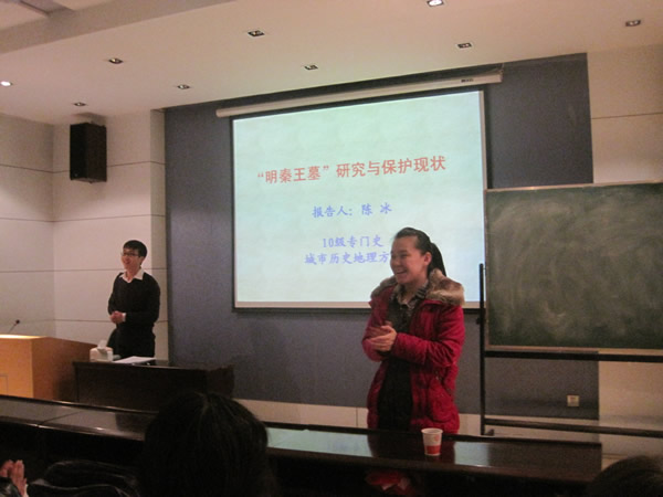 报告结束后,现场同学和陈冰就“明秦王墓”相关问题进行了探讨。唐亦功教授对陈冰的讲座进行了点评,她肯定了陈冰同学对“明秦王墓”研究所做的努力,并指出此次报告思路清晰,语言干练,希望同学们能够多多学习。