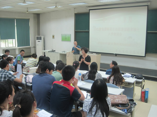 7月19日上午在学校2012级免费师范生在职攻读教育硕士开学典礼结束以后,学院在文渊楼102教室召开了2012级免费师范生在职攻读教育硕士入学欢迎会,学院党委书记丁虹,副院长梁志胜、韩旭晖,研究生辅导员柴永昌,以及全体2007级攻读教育硕士的免费师范生参加了此次会议。