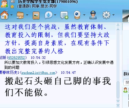 09级本科生党员在听取胡锦涛总书记的工作报告时,利用09级本科生支QQ群这样的网络平台纷纷畅谈感想。对于教育公平、收入差距、户籍藩篱、公共服务等展开了激烈的讨论,尤其是针对教育体制及教育投入等与同学们生活、工作迫切相关的话题进行了深入探讨。孙巍指出虽然现行有教育体制、教育投入的限制,但我们仍要坚持大政方针,提高自身素质,在现有条件下教出拥有破完整完善的人格的学生。