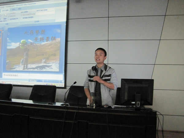 柴永昌首先简要介绍了唐朋同学及其在2012暑假单车走西藏的基本情况。随后副院长曹伟在讲话时说,得知唐朋同学单车走西藏,我们很“震惊”,对他的毅力和拼搏精神深感钦佩,举办此次报告会就是希望让更多的人知道唐朋,学习唐朋这种精神。唐朋同学分六个篇章介绍了此次毕业旅行。在第一章他讲述了去西藏的前期准备工作。他说为了此次旅行,自己从大三开始就坚持跑步,锻炼身体,积攒费用买相机与山地车,积累骑行经验。在第二篇章他讲了到汉中及其路上的一些事迹。在第三章他讲了到成都途中的一些情况。这一时期他主要是出陕入川,经过广元、阆中、德元到达成都,并重点给我们讲述了四大古城之一“阆中”的一些情况。在第四章他讲了从成都到拉萨的情况。经过了雅安、茶马古道、泸定、康定、雅江、理塘、巴塘,过金沙江大桥进入西藏。在前行的同时唐朋也见到了别样的景色,如怒江七十二拐,川藏线第一高山——米拉山口。在第五章他讲了到拉萨的情况。8月16号,经过一个多月艰难的长途跋涉,唐朋终于看到了梦里千绕百回的布达拉宫。在第六章唐朋讲了他此次旅行的感悟及收获:第一,出行前一定要充分准备,自己因疏忽了高原无信号,而使家人联系不上令亲人担心。第二,坚持,从西安骑车到拉萨,3100公里,一路上的艰苦难以想象,坚持下去的毅力才是最重要的。第三,千里之行,始于足下,要有敢于出发的勇气。第四,所谓“读万卷书不如行万里路”,而行万里路的目的在于学会热爱生活。