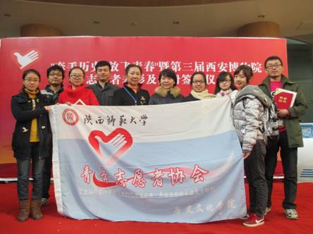 【通讯员:张洪山】2012年12月5日上午,我院青年志愿者协会西博团队参加了西安博物院举办了“牵手历史 放飞青春——第三届西安博物院志愿者表彰及注册签字活动”。我院党委副书记杜海斌老师作为嘉宾出席本次活动。