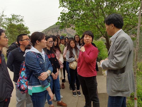 考察终站是位于泾阳县张家村的泾惠渠渠首。泾河夹在青山当中,水流清澈碧绿,平行紧挨着的是用于灌溉的引水渠。考察队边沿着山路前行边听李令福教授讲解自古至今泾河水利引水口抬升趋势、渠首大坝的加高过程和李仪祉先生与杨虎城将军集资修筑现代化泾惠渠等历史知识,李老师还提出关中工业、农业和生活用水集中规划调度,建立以色列式生态节水模式的构想。同学们收获颇丰,意犹未尽。
