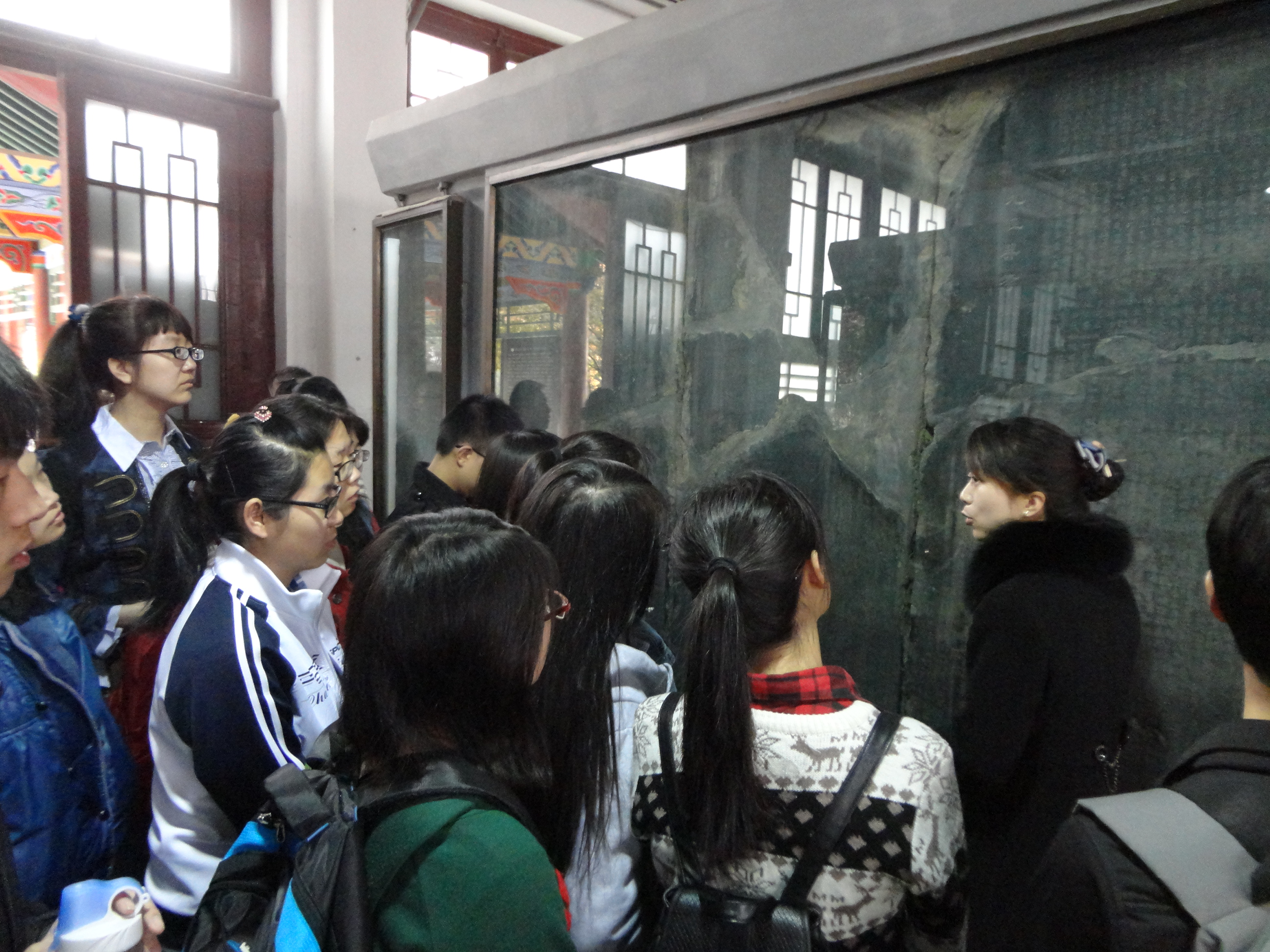 讲解员老师首先为志愿者们介绍碑林的概况与发展史。而后正式对碑林所藏文物进行介绍,从碑林的“迎客第一碑”《石台孝经》,到被誉为“石质书库”《开成石经》;从石刻艺术馆到佛教造像馆,同学们被碑林丰富的藏品以及中华文化的博大精深深深折服。碑林馆藏的134件国宝级文物,使同学们大开眼界,如昭陵六骏(其中四骏为真品)、《多宝塔感应碑》、《颜氏家庙碑》、《大唐三藏圣教序碑》,尤其是其中的碑刻,志愿者中不乏书法爱好者,对其颇有研究,在与老师交流过程中,对唐代书法艺术的了解有了进一步的提升。在老师讲解过程中同学们细心聆听,认真在讲解词上勾勾画画,与老师有良好的互动。讲解结束后,三位老师对同学们进行了面试,询问了同学们听完讲解后对碑林的感受与理解。在面试过程中,韩静雪、梁霄、马涛、苏彼克等同学表现突出,受到了碑林老师们的好评。