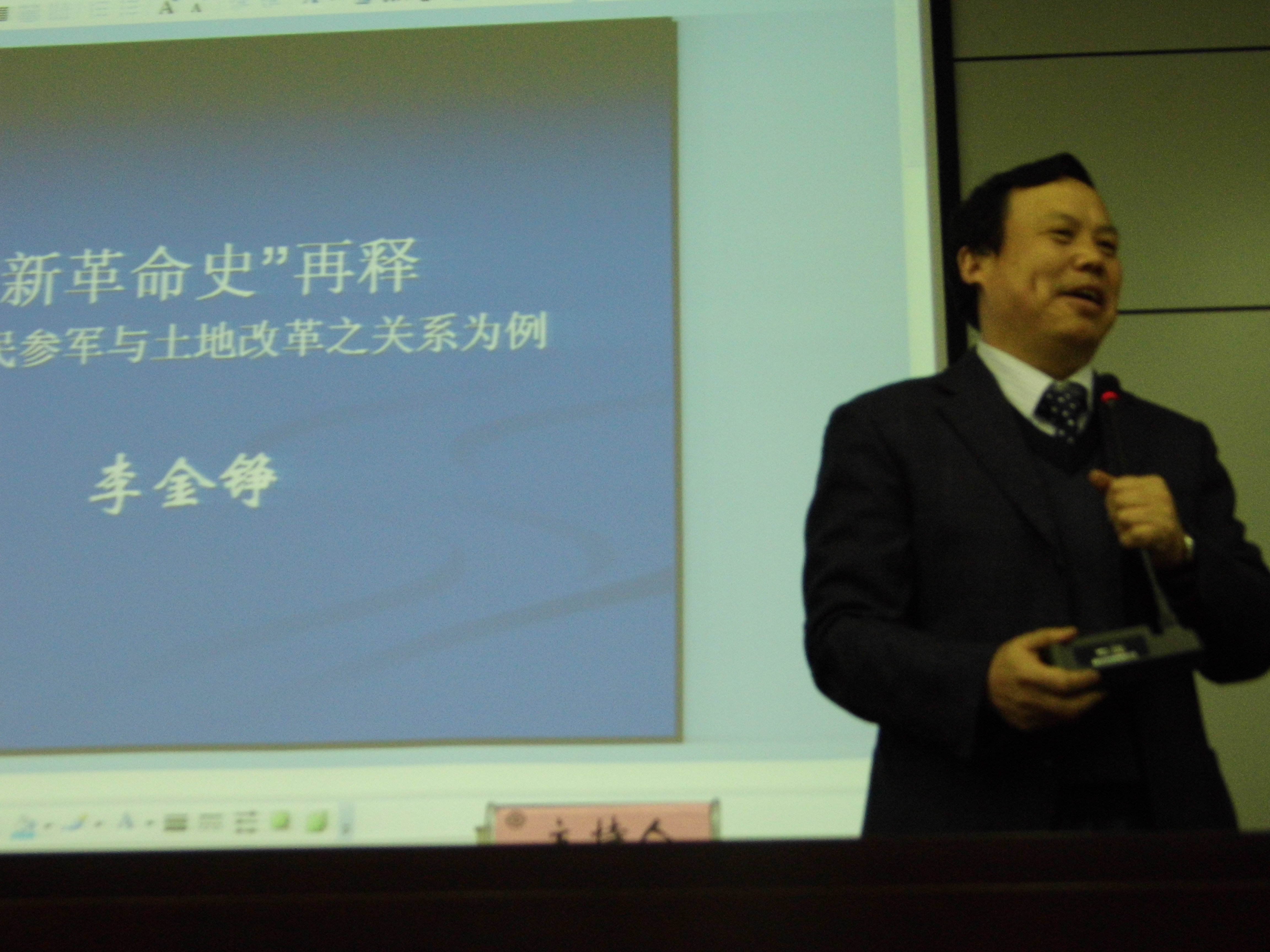 李教授首先界定“新革命史”的定义,强调研究中国革命时代的土地问题应改变传统的革命史观,引进新的思维、新的理念、新的研究方法。其次,他分析农民参军的原因,这是本次讲座的主要内容。这些原因不仅表明农民参军与土地改革的关系以及中共革命胜利的原因,还反映出物质利益与农民心态、行为选择的关系。最后,讲到土地革命中人民参军的复杂性问题,这说明了中共革命的复杂性和艰巨性。
