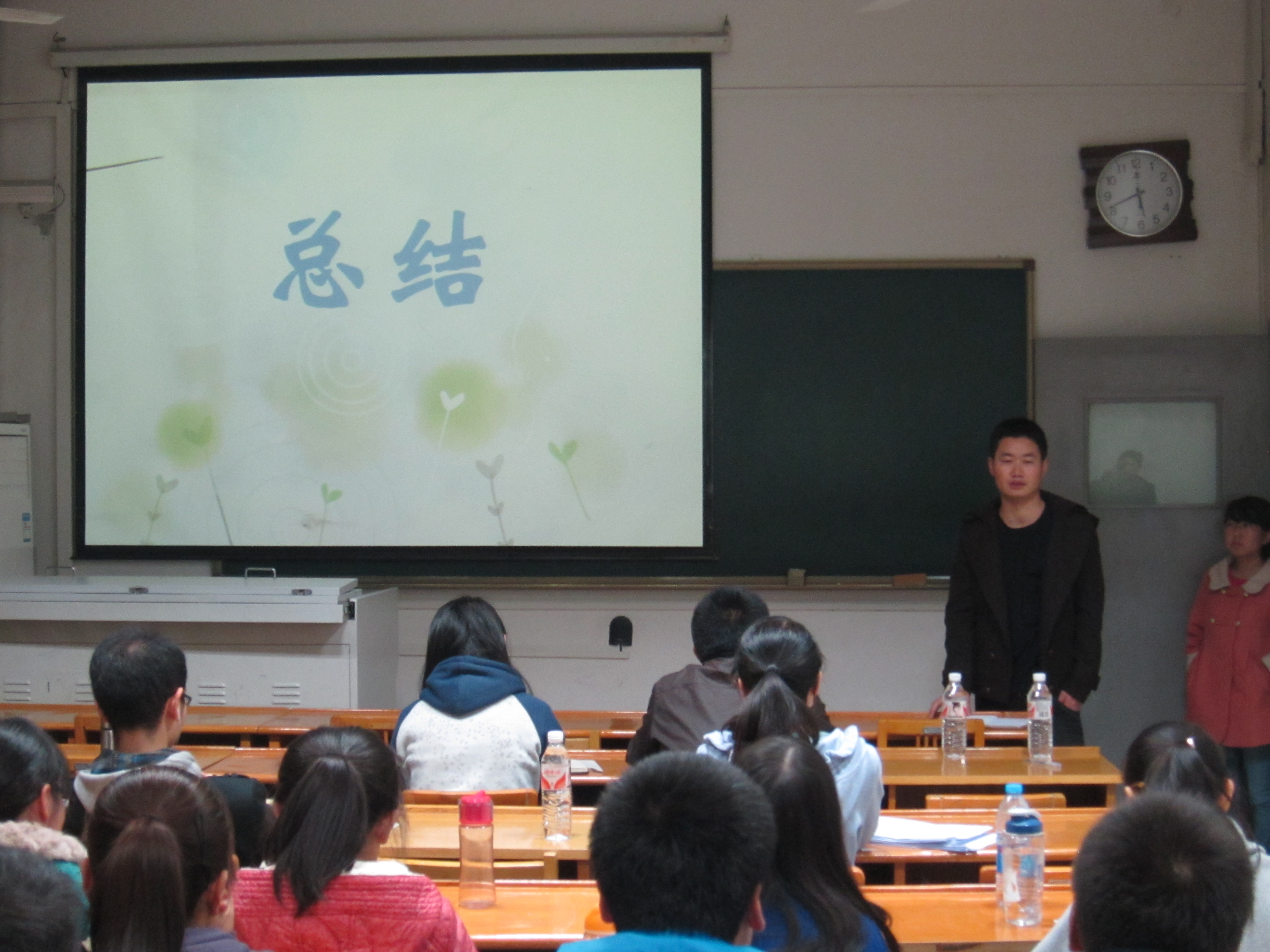 最后,张老师向同学们介绍了2008级博物馆班学长们的就业和考研情况并针对此次团日活动作了总结,张老师认为本次团日活动的主题选题很恰当,符合同学们的实际,他称此次活动非常成功,也很有意义,但同时也存在不足,希望下次改进。至此,11级博物馆班团日活动圆满结束。