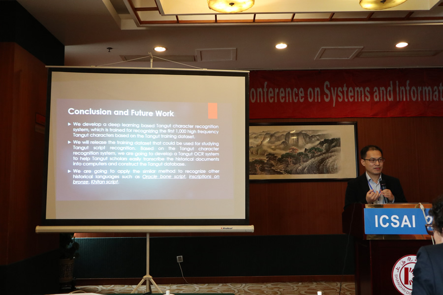 我院教师张光伟参加大会,并在计算机视觉分组对提交的论文“Deep learning based Tangut character recognition”(基于深度学习的西夏文识别)进行口头报告。报告引起与会专家学者对使用人工智能技术解决历史文献识别问题的关注。张光伟和来自Intel的Kevin Lee共同主持了计算机视觉分组的讨论。