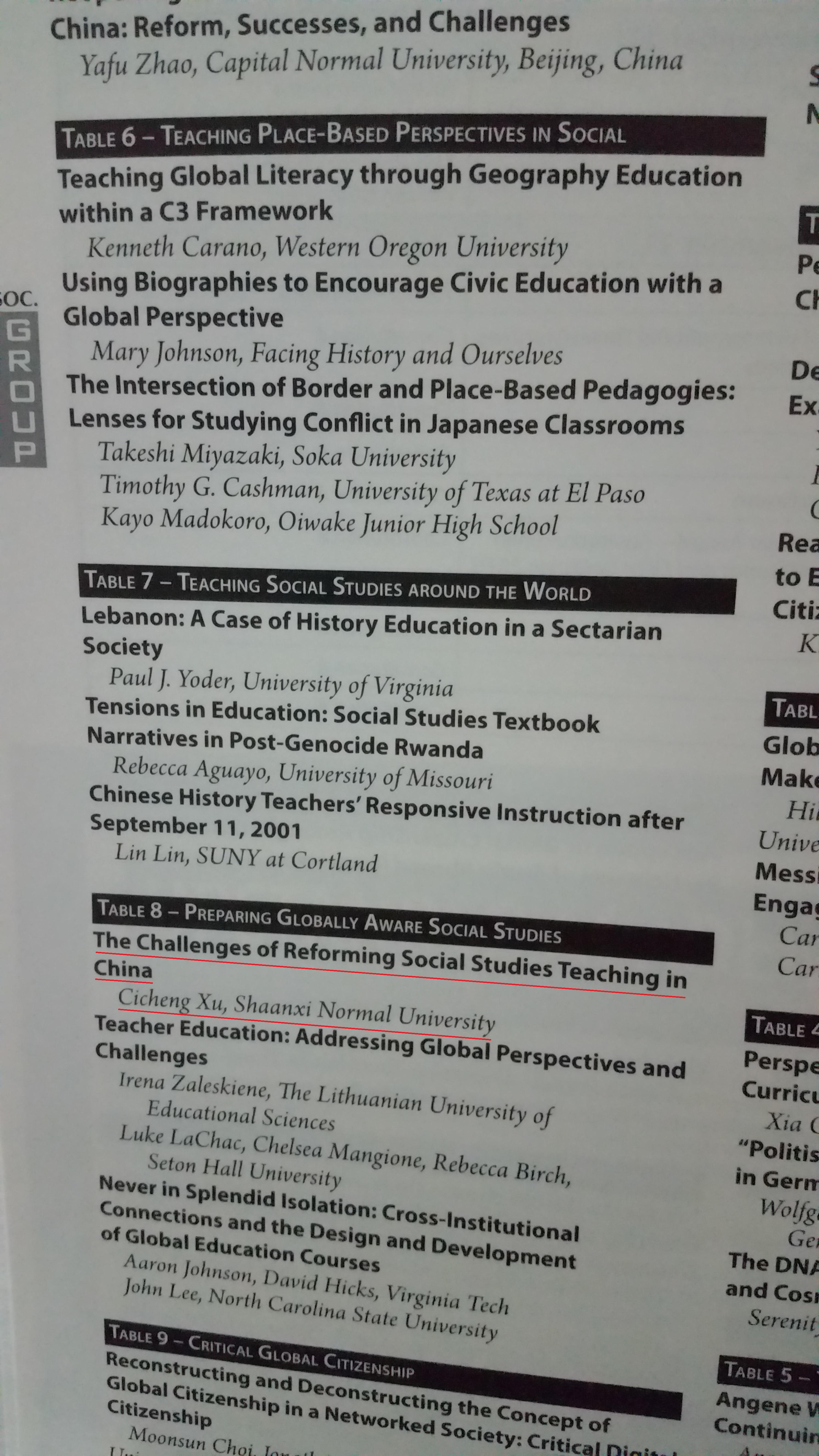 应大会主席邀请,徐赐成博士作了《Challenges of Chinese Social Studies Reform》的主题发言,并就此问题与国际同行进行了深入交流,得到充分认可,为进一步国际学术交流奠定了基础。会议期间有教育成果及图书展,展出了各国的社会科教材,尤其是校本课程、地方课程、学生实践课程教材类型多样,内容丰富,反映了社会科教材建设方面取得的突出成就。徐赐成博士还应学会邀请,成为美国社科教育国际联合会的注册会员,享受国际社会科教育资源共享的权限。
