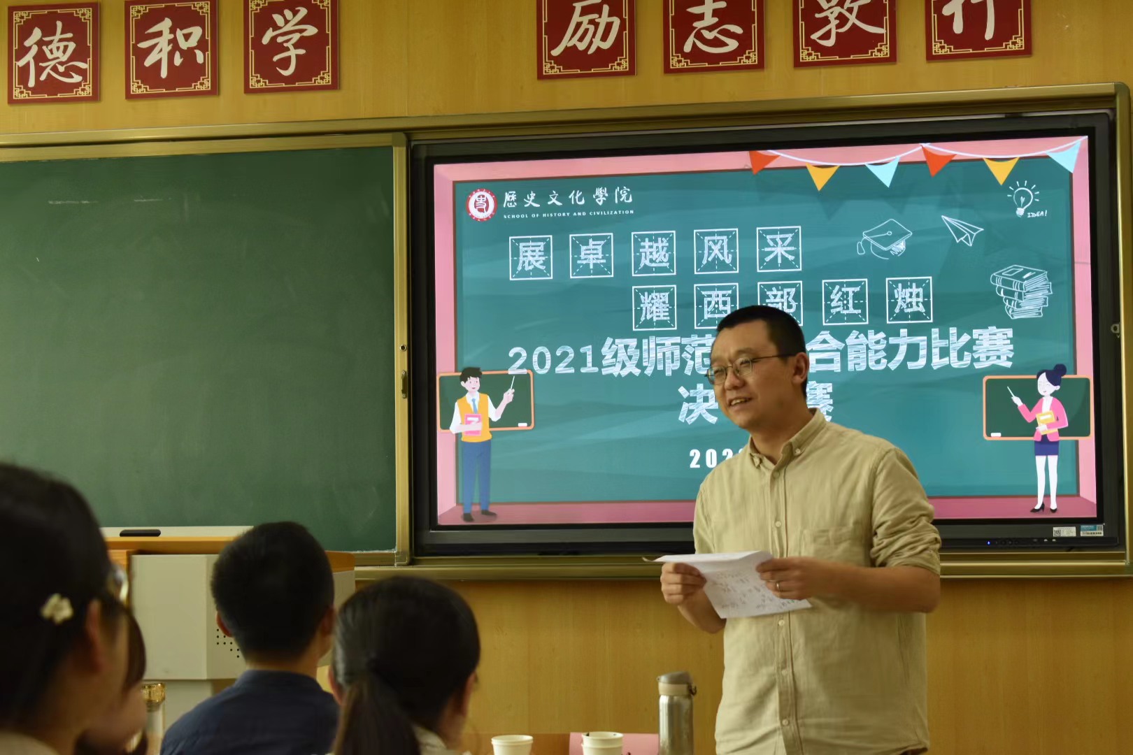 2021级220名师范生参加了此次比赛,经过前期班级初赛、年级复赛,12名选手脱颖而出顺利进入学院决赛。6月7日下午,比赛决赛在长安校区文渊楼1402教室举行。学院历史教育学学科带头人徐赐成教授,西安市曲江新区教研员、曲江二中历史教研组组长刘青青,西安市曲江一中历史教师高文昌,学院副院长郭响宏副教授、于海兵副教授出席比赛并担任评委。2021级本科生辅导员王致轩以及各年级学生代表30人现场观摩了比赛。