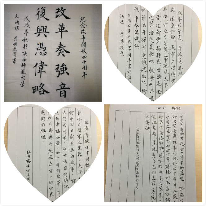 三笔字比赛是每年的常规活动,今年的主题是为了纪念改革开放四十周年。实行改革开放的政策一眨眼四十年过去了,正是因为有中国共产党的领导和全国人民的团结一致我们才拥有了今天的美好生活。现在的奔小康生活是乘着改革开放的快车才实现的,因此无论何时我们都要拥护党的领导,紧跟党团的步伐,胸怀坚定的信念,脚踏实地,开拓未来。相信通过这次活动,各单位的同学们在今后的学习生活中会更加积极地学习党团文件,领悟党团思想,身体力行,实践出真知。