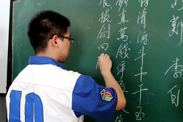 比赛分为三个部分,首先是钢笔字的书写。参赛学生先从准备好的题目中抽取将要完成的比赛题目,然后在规定时间内完成钢笔字作品。2013级古典文献班李舜同学书写的行楷作品得到大家的一致好评。第二部分是粉笔字的书写。书写粉笔字作为教师必备的基本技能,一直是我院师范班同学练习的重点。师范班选手发挥自如,非师范班的选手也不甘示弱。最后一部分是毛笔字的书写。正当同学们书写毛笔字时,楼道里摆放的已经书写完成的毛笔字作品引起了萧正洪老师的关注,他驻足欣赏了几位选手的作品,并与同学们就如何写好毛笔字进行了交流,使同学们受益匪浅。