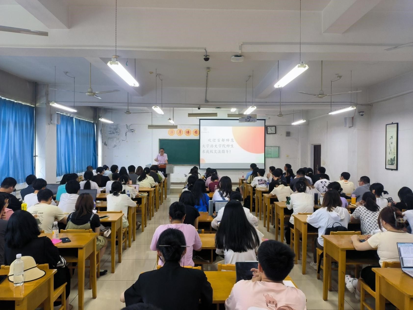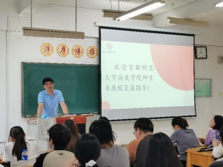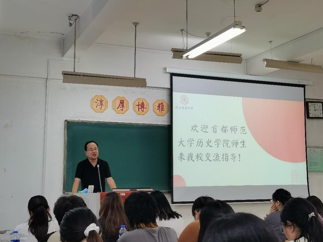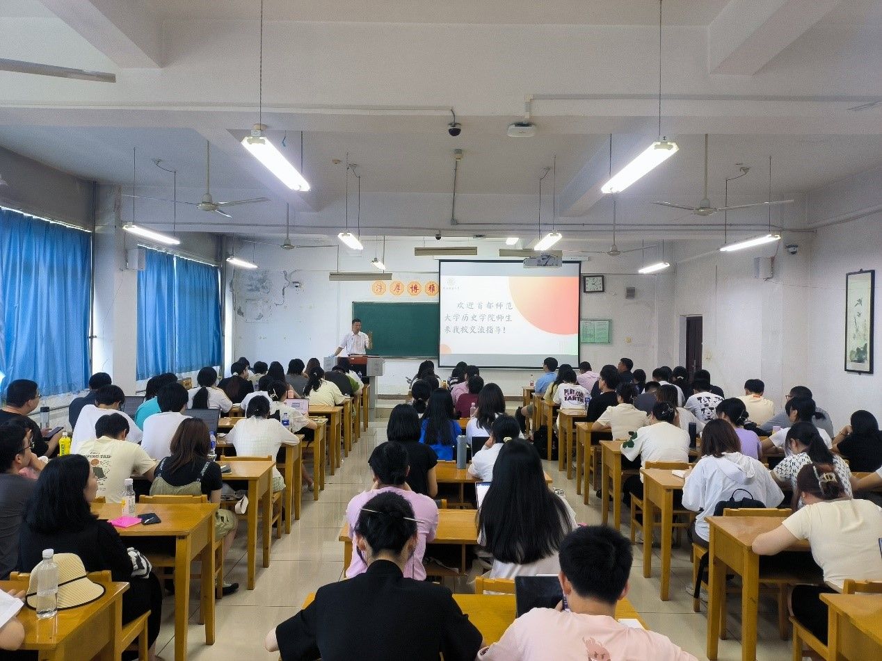 为进一步提升学科建设水平,深化院校之间合作交流,更好完善历史学师范生培养与学生交流机制,2023年6月29日,首都师范大学历史学院2020级58名师范生、5名研究生及3名带队教师,来我院开展学习交流活动,我院2020及历史学卓越教师试验班20多名学生,学院教学副院长郭响宏参加了交流活动,活动由学院历史教育方向负责人徐赐成教授主持。